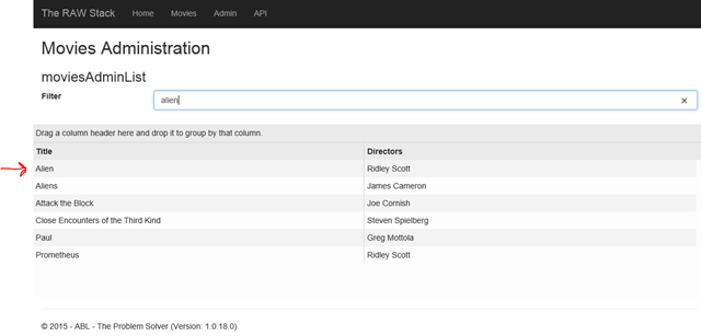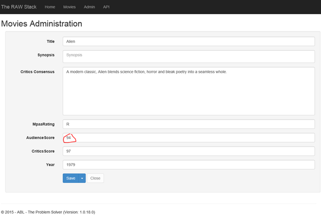After clicking the row we now will see the admin page for this row and we can finally search for the audienceScore input. This control has an Id, so the search for that is very simple and robust. Reading out the value and then asserting on that is nothing more then reading the Text property and asserting on that value. The code for that is as follows: