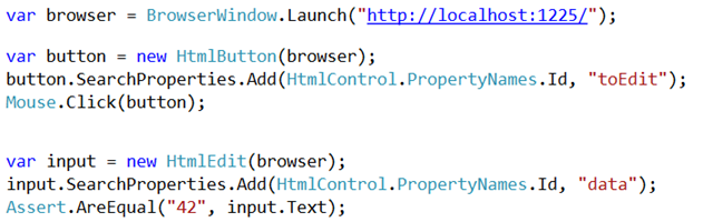HtmlEdit audienceScore = new HtmlEdit(bw); audienceScore.SearchProperties.Add(HtmlDiv.PropertyNames.Id, "audienceScore"); var audienceScoreValue = int.Parse(audienceScore.Text); Assert.IsTrue(audienceScoreValue == 94); |